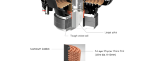 A newly incorporated 6- layer copper voice coil with aluminum former, improves heat resistance. The air convection generated from the vibration of the diaphragm is effectively used to cool the voice coil, contributing to the speakers power handling and ability to dissipate heat.